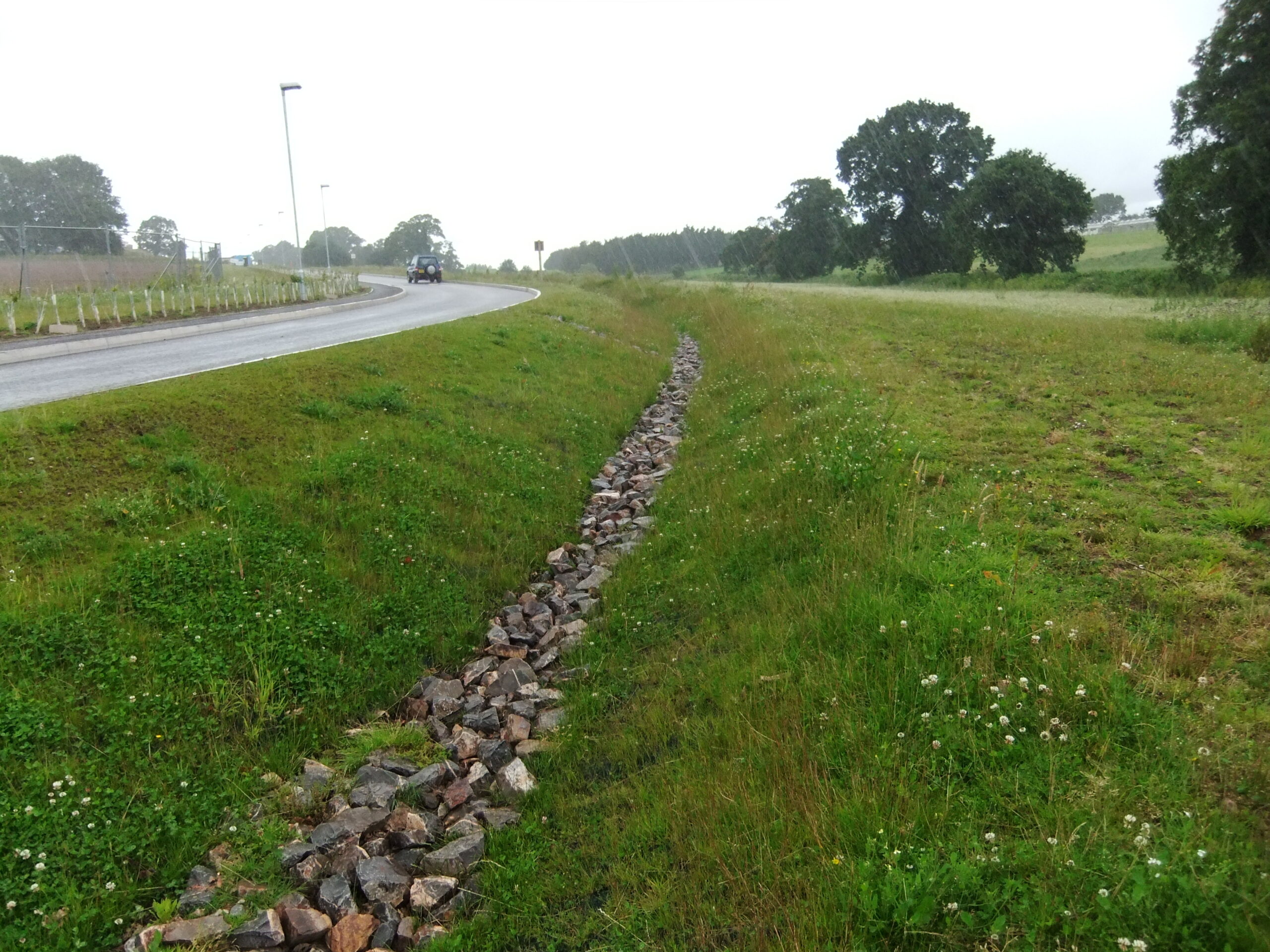Swales are broad, shallow, linear vegetated channels which can store or convey surface water (reducing runoff rates and volumes) and remove pollutants. They can be used as conveyance features to pass the runoff to the next stage of the SuDS (Sustainable Urban Drainage System) treatment train and can be designed to promote infiltration where soil and groundwater conditions allow. Swales are applicable to a wide range of situations. They are typically located next to roads, where they replace conventional gullies and drainage pipe systems. Other examples can be located in landscaped areas, adjacent to car parks, alongside fields, and in other open spaces.